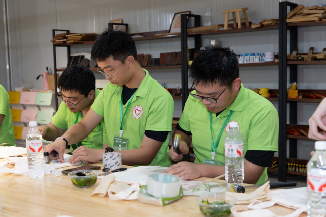 图为营员在翰雅农村学习植物敲染非遗技艺